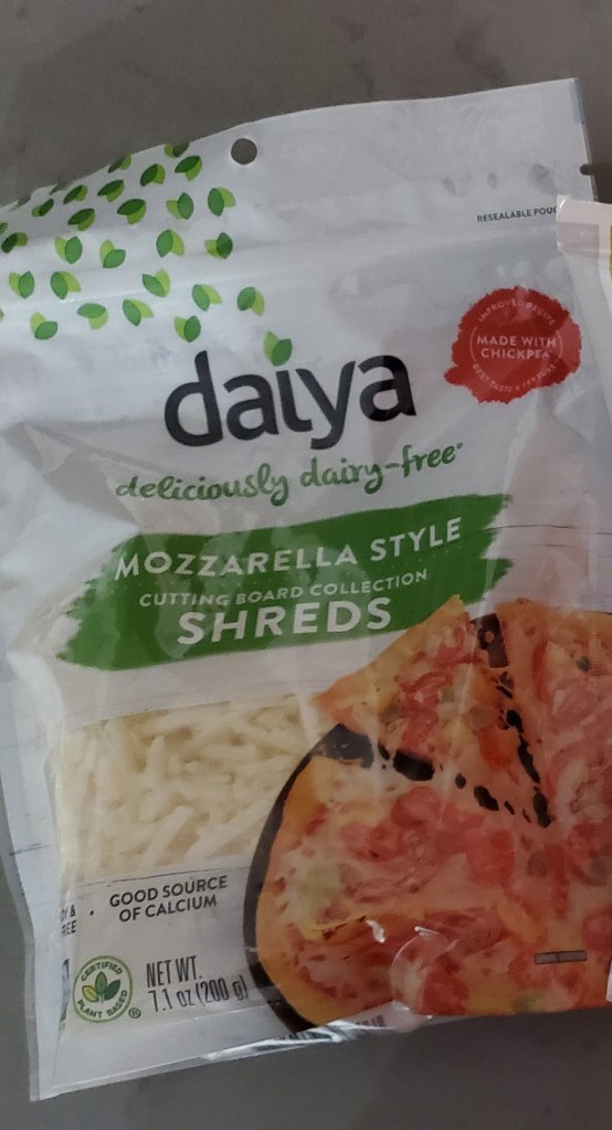 There’s several vegan mozzarella choices these days, but I usually go with Daiya’s mozzarella style shreds.