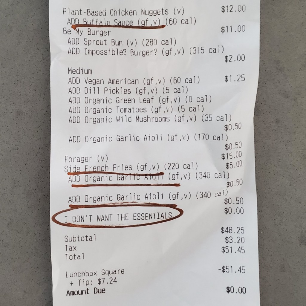 I was about to sing a lament for the old Bareburger menu, but that stuff doesn’t exist anymore. What’s done is done. I will say that I miss the ease of access that the old menu offered, where vegan and non vegan items were separated clearly, but everything’s just thrown together now. And you used to be old you choose between the Impossible and Beyond burgers, but they only have the Impossible now. Okay okay, what’s done is done!