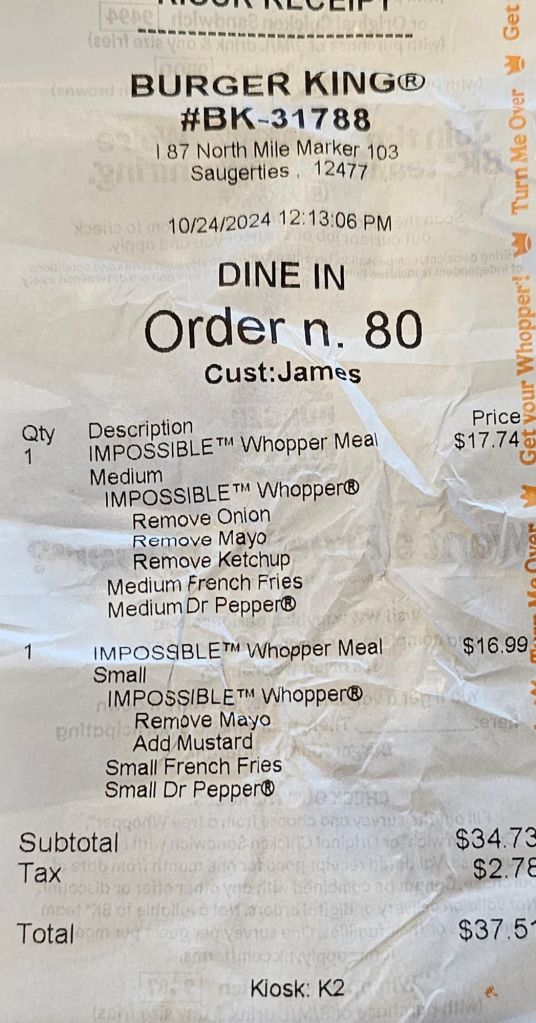 This kind of greed-flation and shrinkflation coupled with the fact that the Impossible Burger I got from Burger King is a tepid imposter to the Beyond Burger I make myself at home has created a situation where I’m only going to BK when I have no other choice.